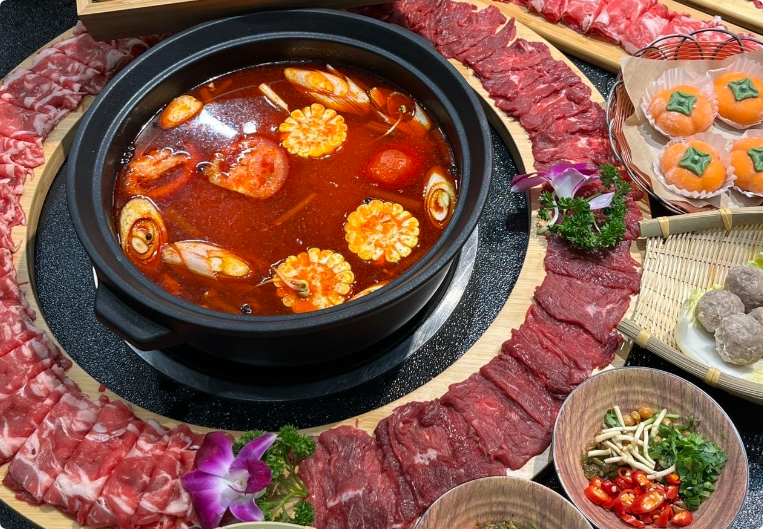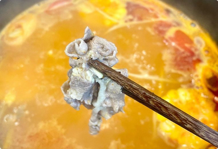 覓山野貴州酸湯牛肉火鍋隸屬武漢市東西湖區(qū)覓山野酸湯餐飲店,店內(nèi)提供純酸湯、酸辣湯和麻辣湯三種鍋底選擇,其中純酸湯鍋底以番茄與米湯自然發(fā)酵而成,湯色橙紅,酸香濃郁順滑,帶有回甘;酸辣湯鍋底則融合紅酸湯的醇厚與麻辣的刺激,口感不燥不嗆,開(kāi)胃適口。蘸料區(qū)提供地道搭配,如蒜泥、燒椒醬、胡辣椒面和折耳根,并推薦使用木姜子油提香,增強(qiáng)風(fēng)味層次。?鮮切黃牛肉是招牌,尤其是吊龍部位,肉質(zhì)鮮嫩,涮燙片刻即可食用,裹滿(mǎn)酸湯后滑嫩多汁;食材選擇豐富,除貴州特色血皮菜、奪奪粉外,還提供多種山野蔬菜和時(shí)蔬,部分門(mén)店蔬菜可無(wú)限續(xù)加,性?xún)r(jià)比高。